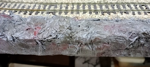 Tras darle varias vueltas a lo que quería hacer, pues quería hacer algo que "rematará" esa zona, pero sin perder la comodidad de tener el frontal diáfano para montar las composiciones, trenes y demás material de forma cercana y sin complicaciones, decidí simular una barrera rocosa como si desde ese punto creciera una zona pedregosa, pero sin hacer el típico "corte de relieve" en negro que vemos en tantas maquetas y módulos, sino de una forma más natural, que quedara a la vista del espectador (la mía) una especie de barrera rocosa...